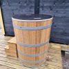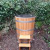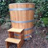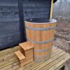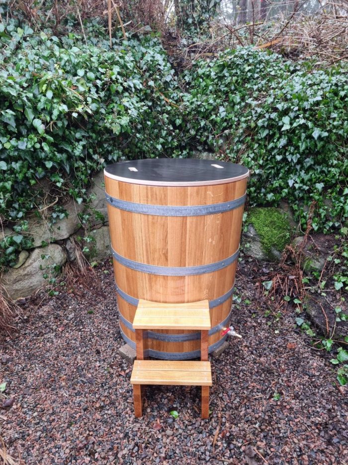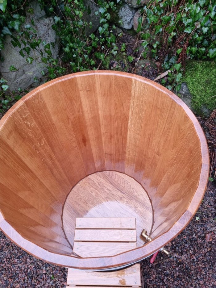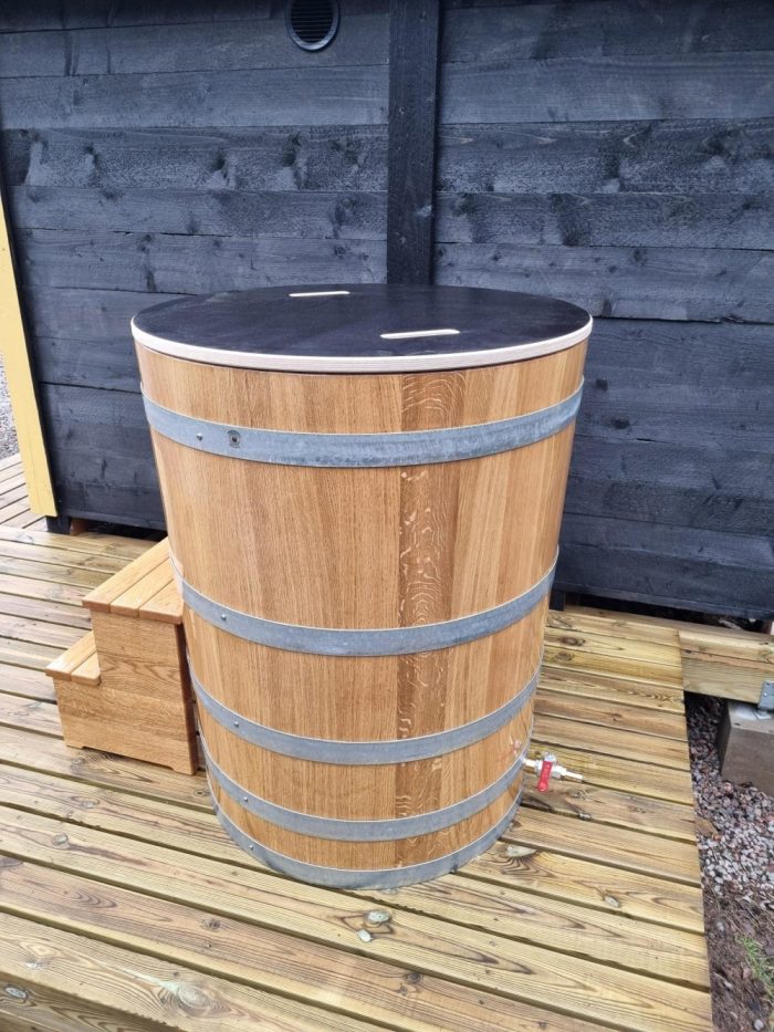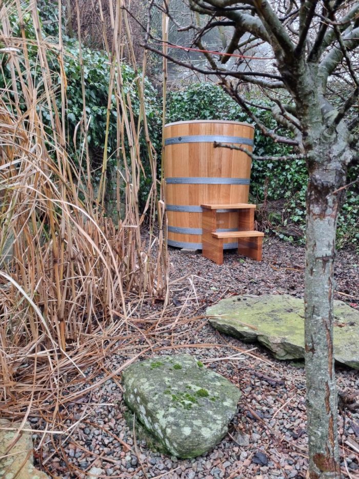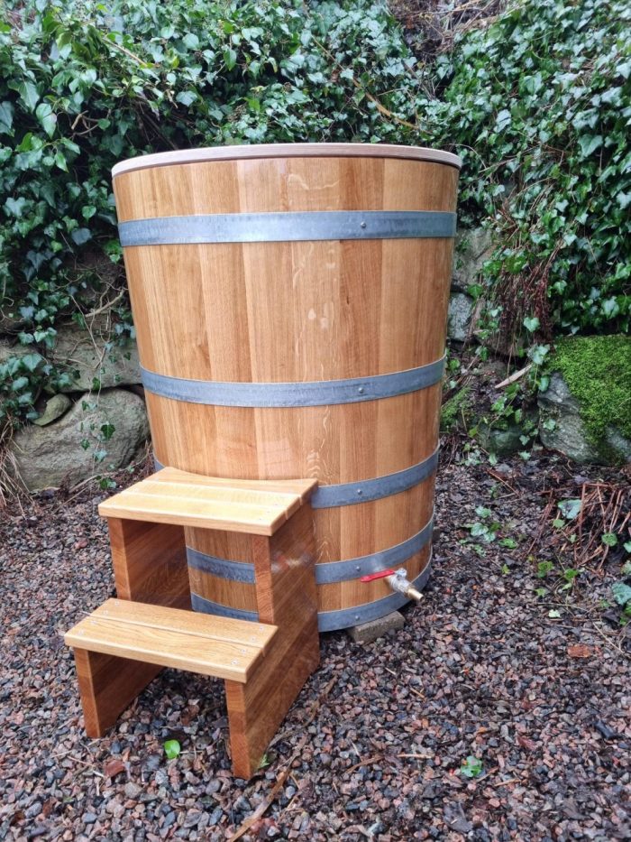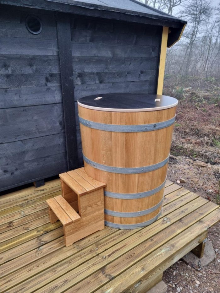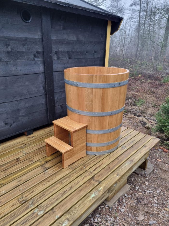 avkoppling och hälsofördelar. Att sänka sig ner i en kall trätunna av ek ger en unik